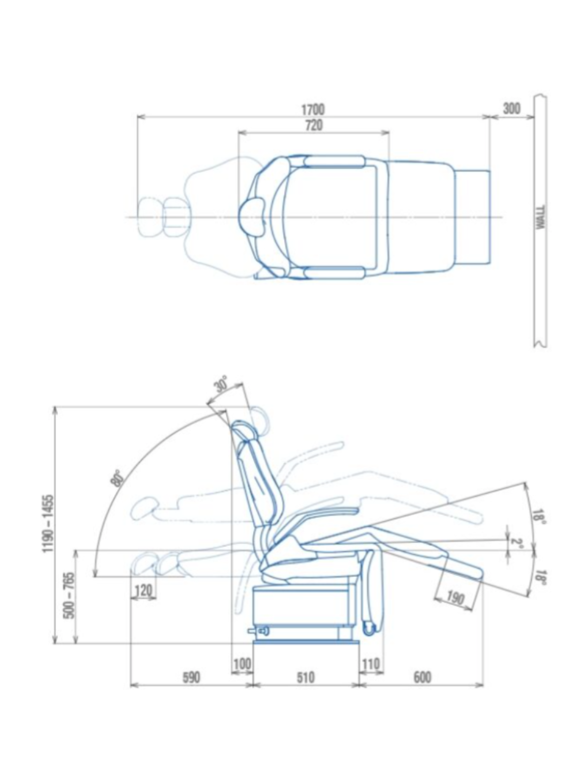 - Automatic extendable legrest with manual override and auto-safety stop