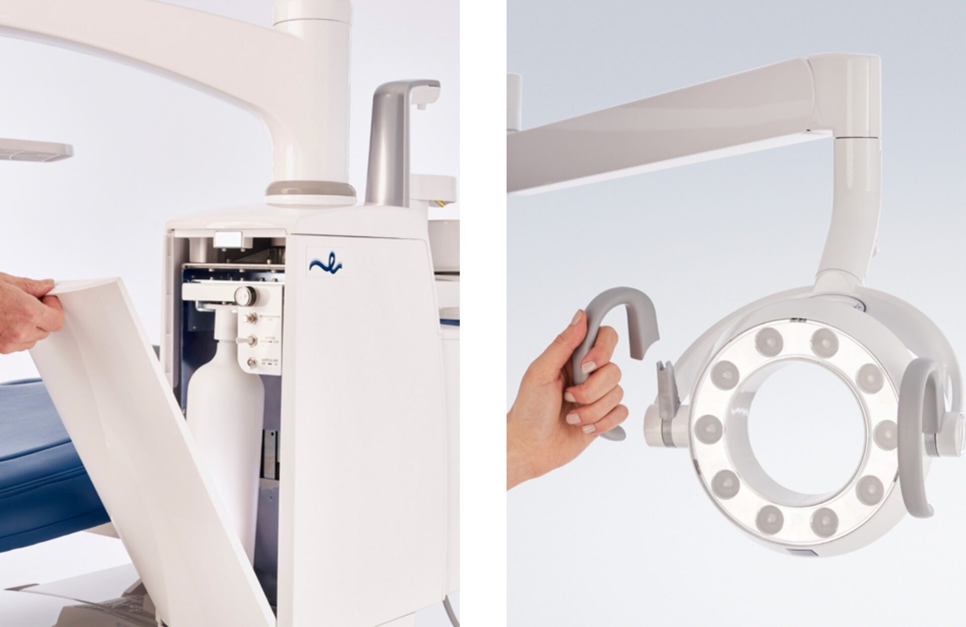 Everything is designed to assist with faster, easier and more thorough cleaning. Light handles, surface mats, instrument holders, handle covers and bowls are all easily detachable for cleaning. Hygiene inside the dental unit is maintained by waterline flushing.