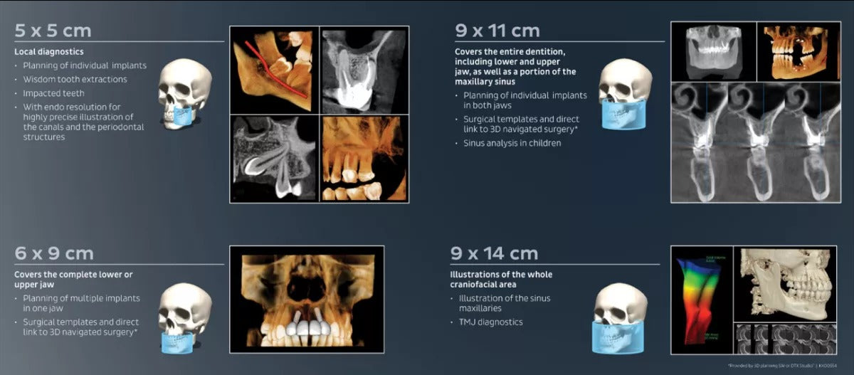 - 4 predefined volumes: 5x5, 6x9, 9x11 and (optional) 9x14 cm - thanks to SMARTVIEW™ 2.0 the volumes are freely positionable and height adjustable in 5 mm steps between 5 and 9 cm before the exposure, leading up to 36 possible FOV sizes in total.