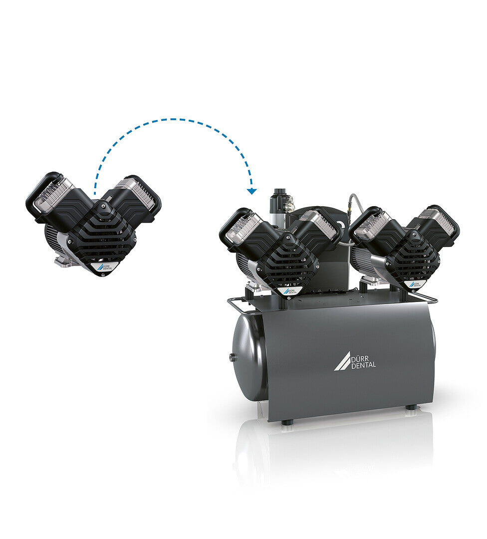 The Tandem line of compressors from DÜRR DENTAL offers particularly high operational reliability and is completely future-proof. The possibility of modular upgrades to the compressed air compressors makes them a flexible solution with the option for more power. A clear advantage of our high-performance dental compressors, as they can grow with the requirements of your practice – according to your needs and field.