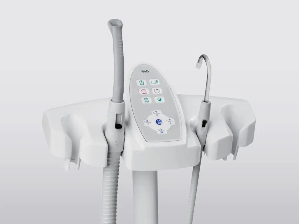 Everything is located on your dentist element where you would intuitively expect it to be. The operating concept is clear and simple. Use direct buttons and the simple KaVo colour scheme to control handpieces, the patient chair and illumination both easily and rapidly.The dentist element can be individually configured according to your technical needs. It offers five handpiece holders and one tray holder which can be installed either on the right or left side of the unit.
