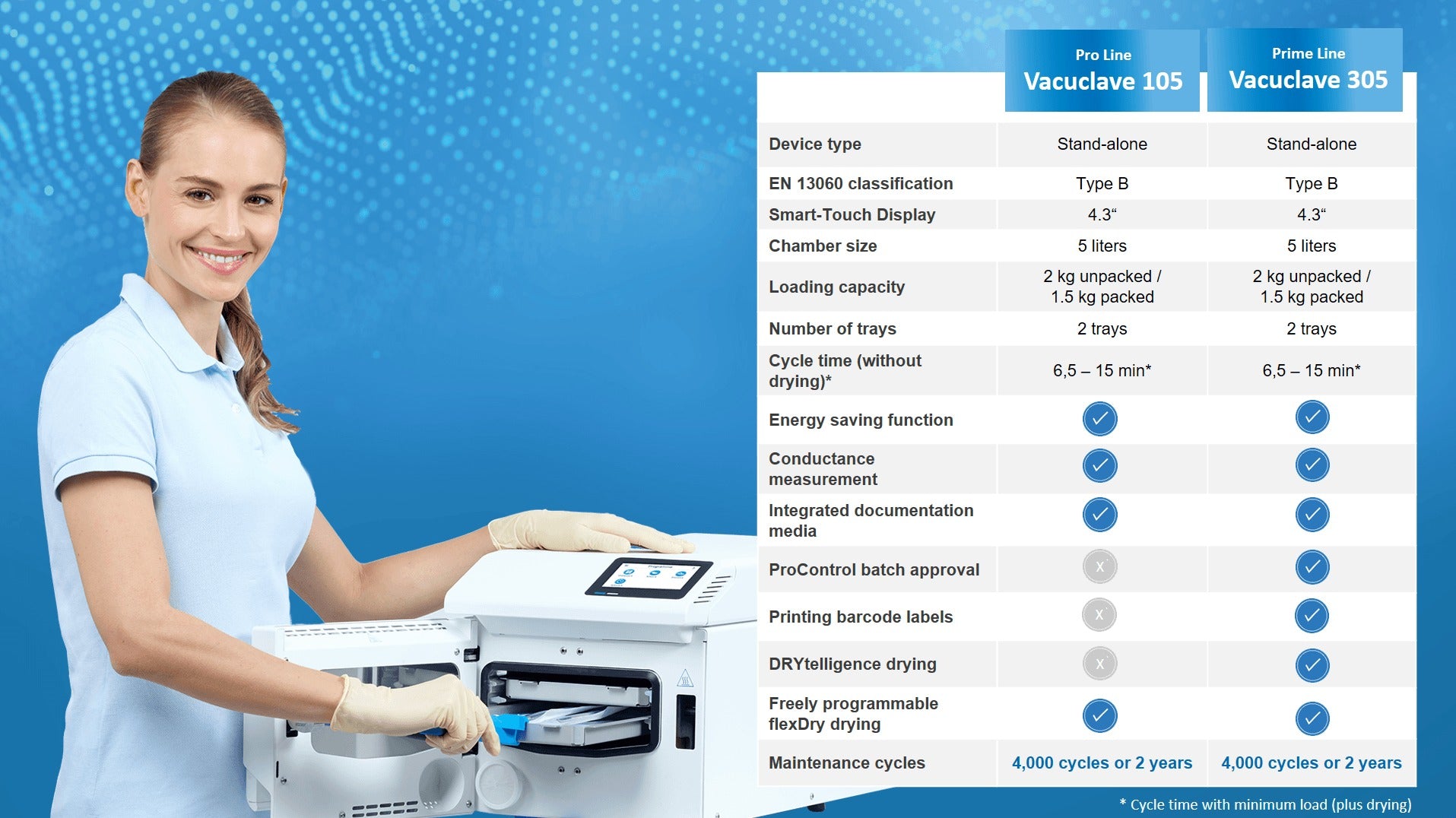 Vacuclave 105; small autoclaves for big dreams: thanks to the unique device concept - 100% made in Germany - you save even more time, money and space during RKI-compliant reprocessing.