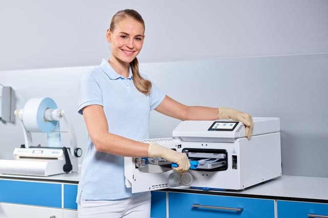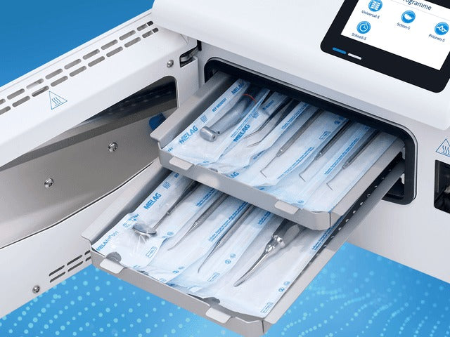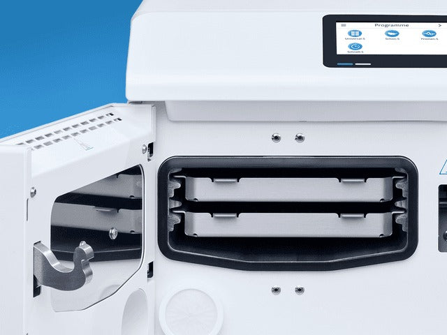 The powerhouse with a chamber volume of 5 liters is a compact class B autoclave that achieves great things: Because with a device width of just 30 cm, the fastest autoclave in its class fits into any reprocessing line: Either as a supplement to your practice autoclave for lightning-fast sterilization between treatments or as a stand-alone device for lower instrument volumes.