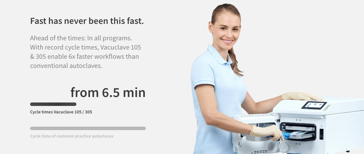 To the future, get set, go! With the fastest autoclaves in their class, we are redefining the limits of speed: With Vacuclave 105 & Vacuclave 305 you can sterilize e.g. up to 22 contra-angle handpieces on 2 trays or in 1 MELAstore Box Compact in record time